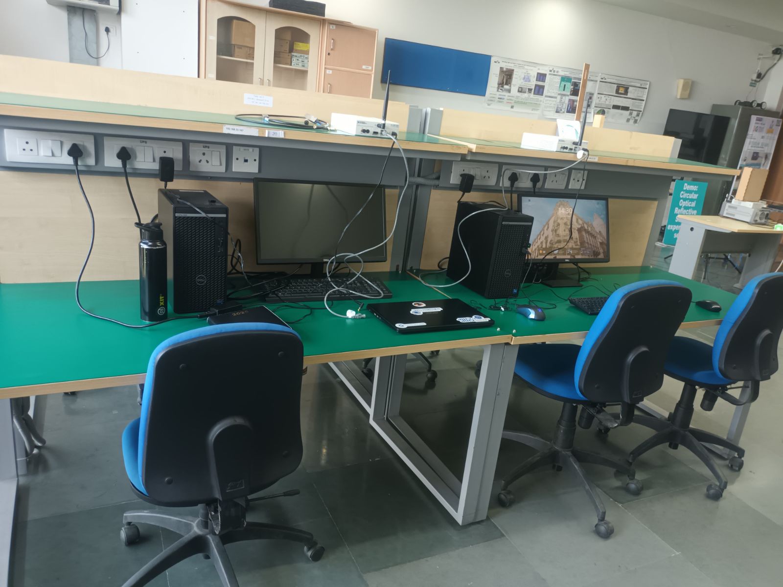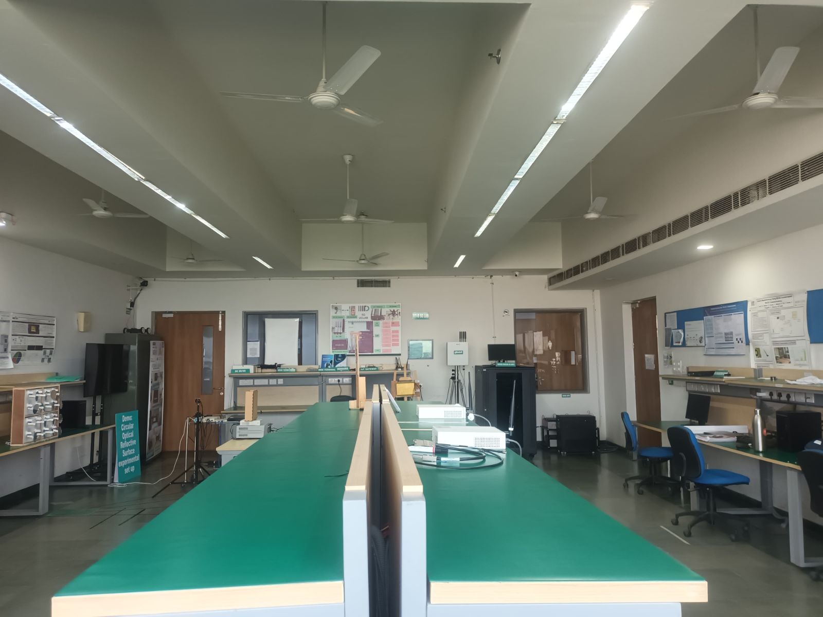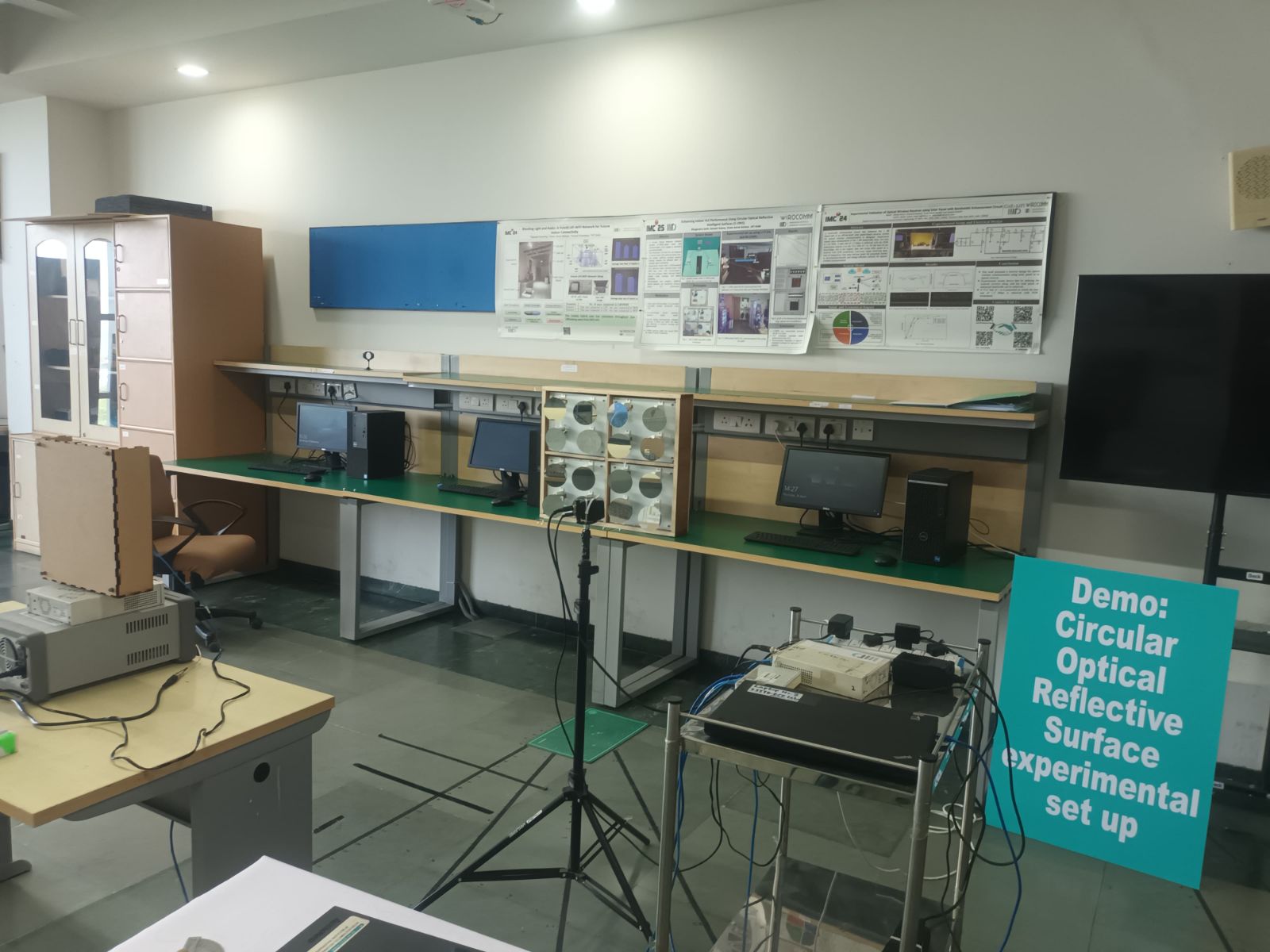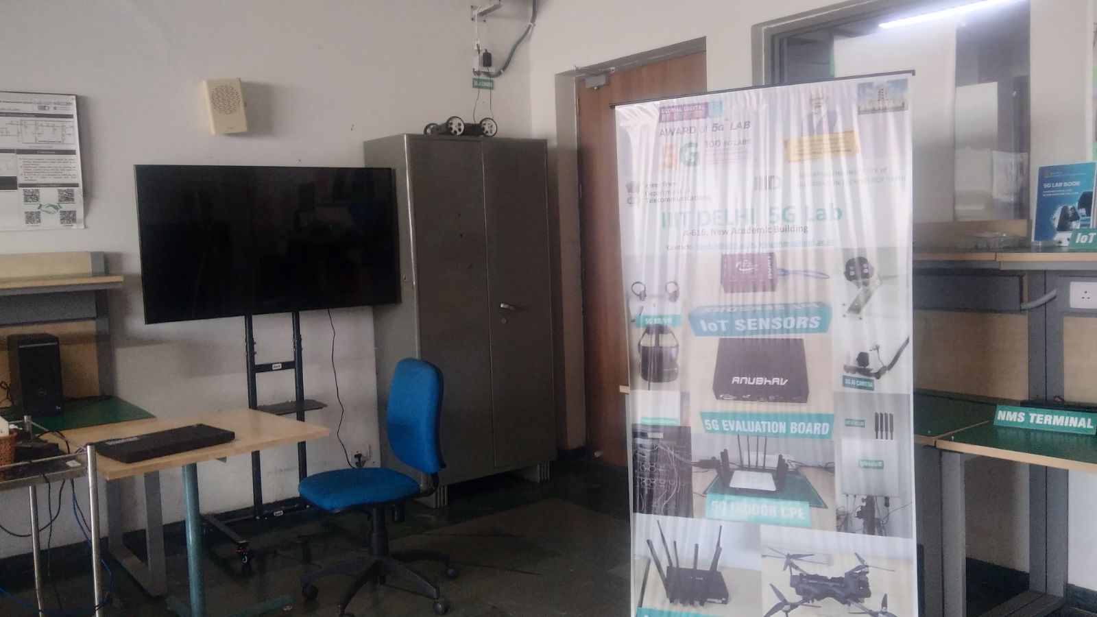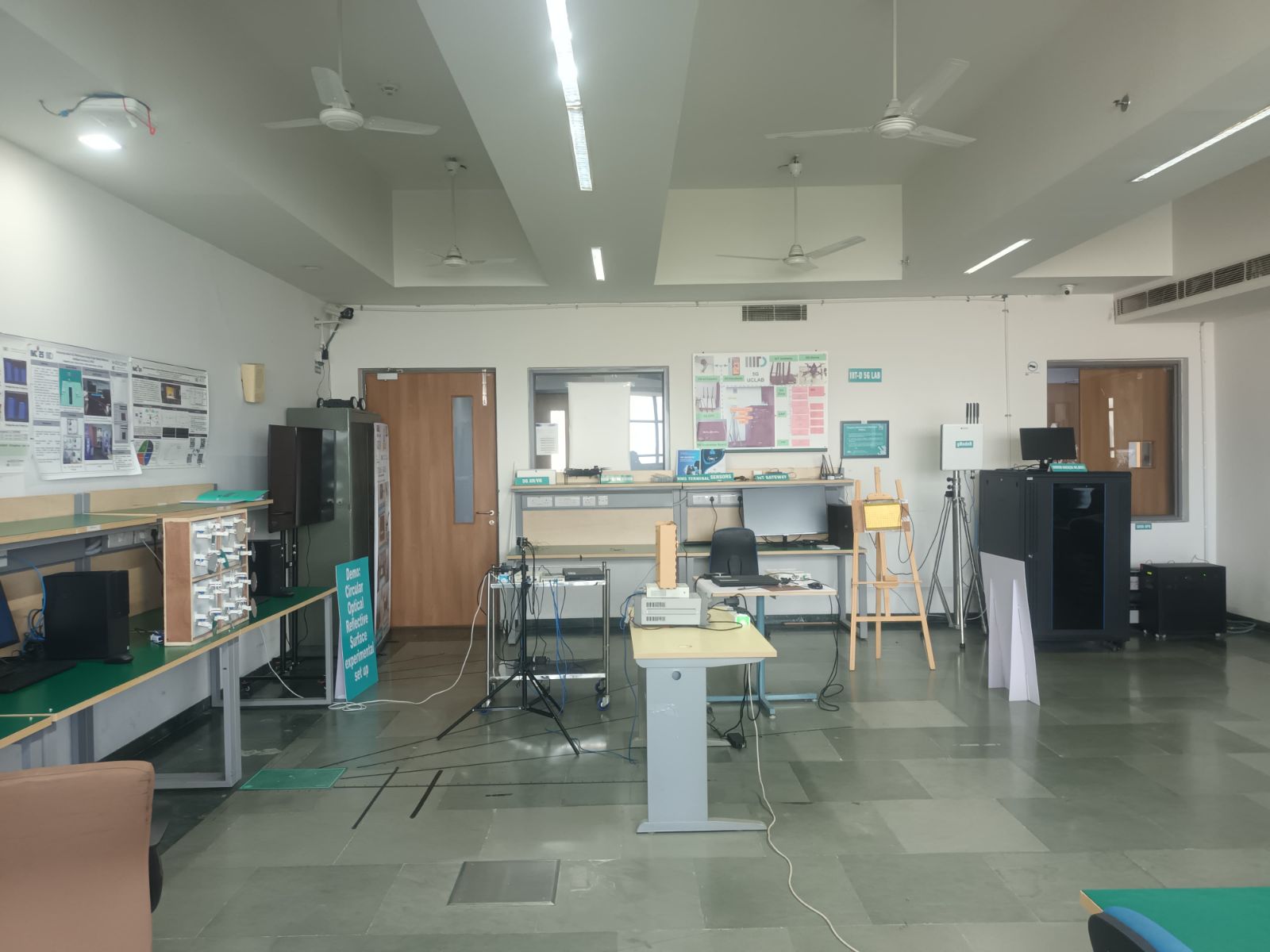 The Advanced ECE Lab at Indraprastha Institute of Information Technology Delhi supports experimental research and hands-on learning in contemporary wireless and electronic communication systems. The laboratory hosts a 5G testbed based on a standalone architecture comprising the 5G core network, radio unit, IP Multimedia Subsystem (IMS), Mobile Edge Computing (MEC) server, and a centralized network management system. In addition, the lab houses experimental setups for Reconfigurable Intelligent Surfaces (RIS) and Optical Reconfigurable Intelligent Surfaces (ORIS), enabling investigations into intelligent signal reflection, beam steering, and communication in non-line-of-sight environments. The facility also includes Device-to-Device (D2D) communication testbeds that allow the study of direct wireless links, cooperative communication, and low-latency networking. High-performance desktop workstations and embedded platforms are available to support real-time signal processing, prototyping, and system-level experimentation. Collectively, the infrastructure provides a practical environment for students and researchers to develop and validate emerging communication technologies, including RIS-assisted wireless systems, optical wireless communication, and IoT-based applications. All the hardware testbeds are supported by Shannon lab.